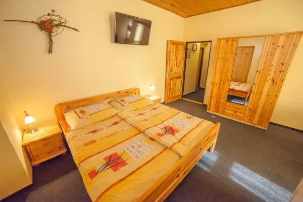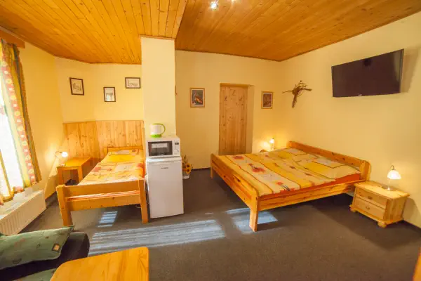 Čtyřlůžkový pokoj s vlastní sprchou, TV s českými programy, rychlovarnou konvicí, mikrovlnkou, lednicí a bezplatnou Wi-Fi.